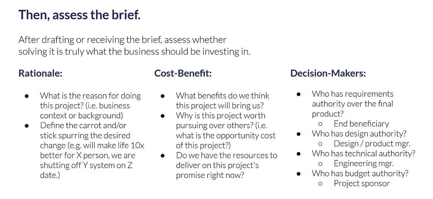 Once you have the brief, you should interrogate it. Doing projects simply because they feel right or because someone told you so is a great way to waste limited resources.